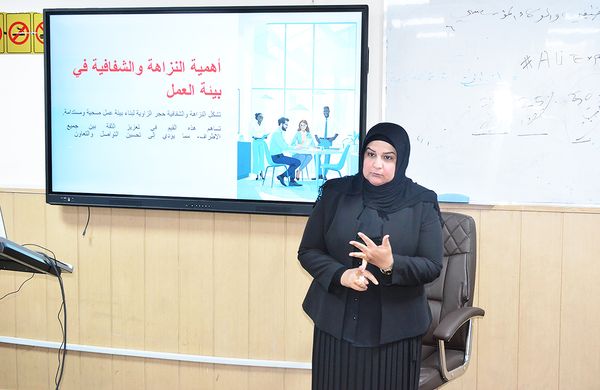 لنزاهة في بيئة العمل ” في يوم الثلاثاء الموافق ١/ ١٠/ ٢٠٢٤ القتها م. د زينب هادي خلف مسؤولة الشؤون العلمية في المركز وقد شارك في الورشة عدد من منسوبي الجامعة .
