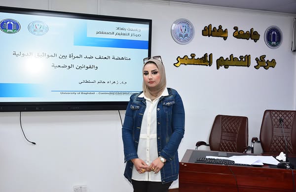 نظم مركز التعليم المستمر في جامعة بغداد ضمن نشاطات لجنة تمكين المرأة ضمن حملة ال١٦ يوم لمناهضة العنف ضد المرأة وبالتنسيق مع شعبة شؤون المرأة/ مكتب رئيس الجامعة الورشة الموسومة (مناهضة العنف ضد المرأة بين المواثيق الدولية والقوانين الوطنية) ، قامت بالقاءها المدرس الدكتورة زهراء حاتم السلطاني التدريسية في مركزنا .