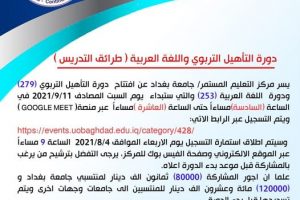 دورة التأهيل التربوي واللغة العربية (طرائق تدريس) رابط التسجيل:- https://events.uobaghdad.edu.iq/category/428/